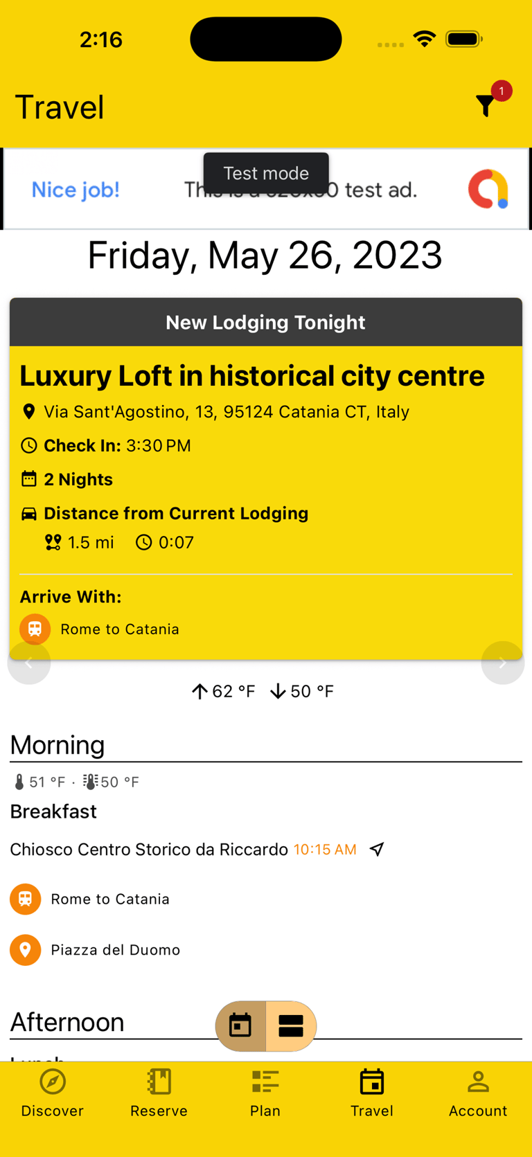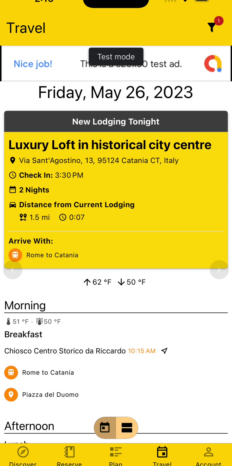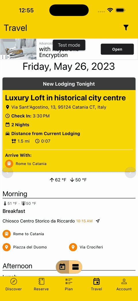 To help you stay on top of things, a "New Lodging Tonight" alert gets shown on your Day view if you're scheduled to change Lodgings. Important information like the address, your check-in time, how long you're staying, how far it's from your current Lodging, and how you'll be arriving there are shown front and center.